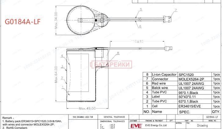 Батарейка літій-тіонід-хлорид (Li-SOCl2) 3.6V 1900 mAh ER34615+SPCl1520/W